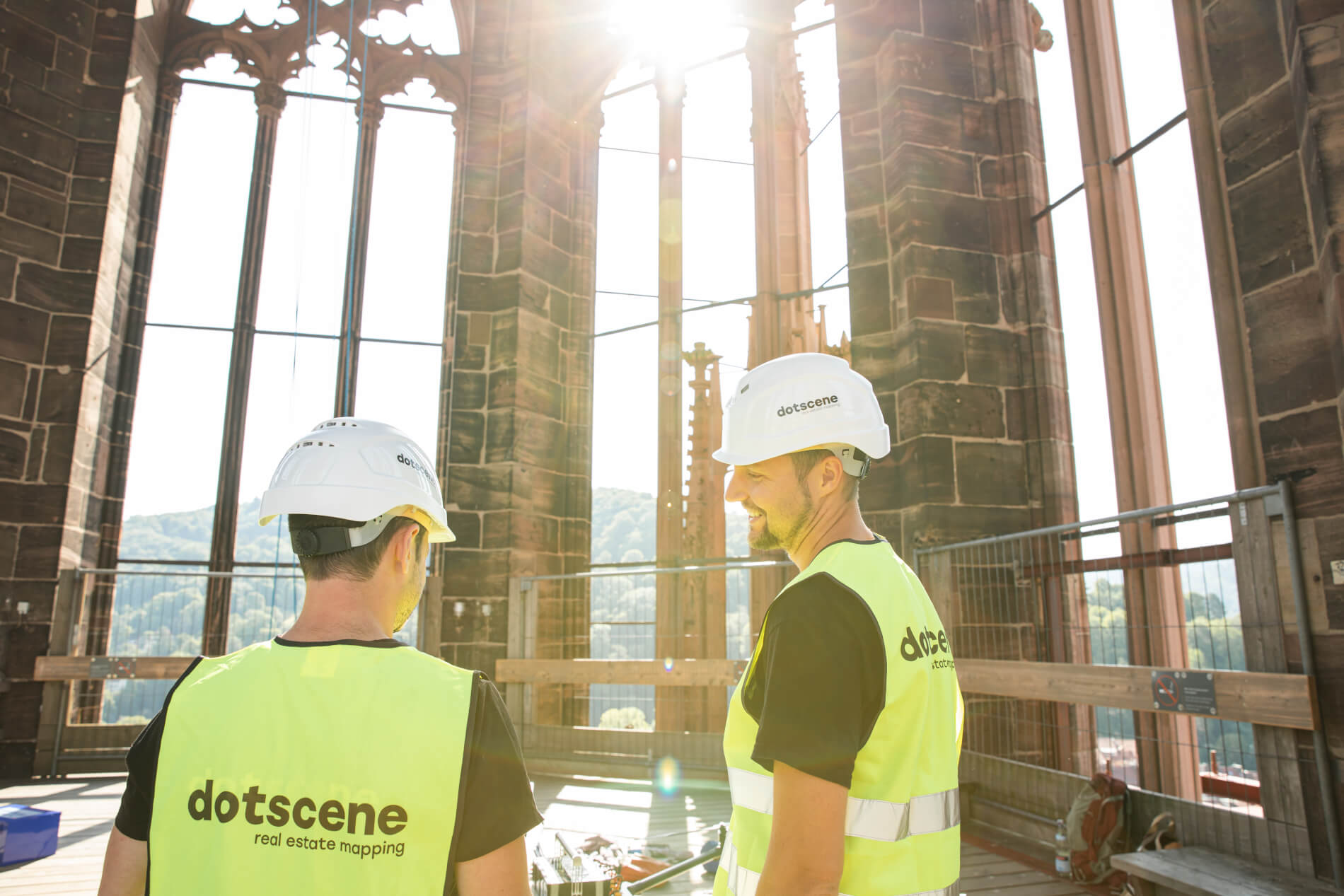 Zusätzlich zur LiDAR Vermessung sollte die jährliche Kontrolle des Münsters, genauer gesagt des Münsterturmhelms und der Oktagonhalle, auf Schädigungen mittels Bestandsbildern erfolgen. Zusammen mit dotscene gingen wir aber noch einen Schritt weiter und führten eine photogrammetrische Bildvermessung per Drohne im oberen Bereich des Kirchturms mit anschließender Auswertung durch. Darüber hinaus erfassten wir die Oktagonhalle mit der gleichen Methode von innen.