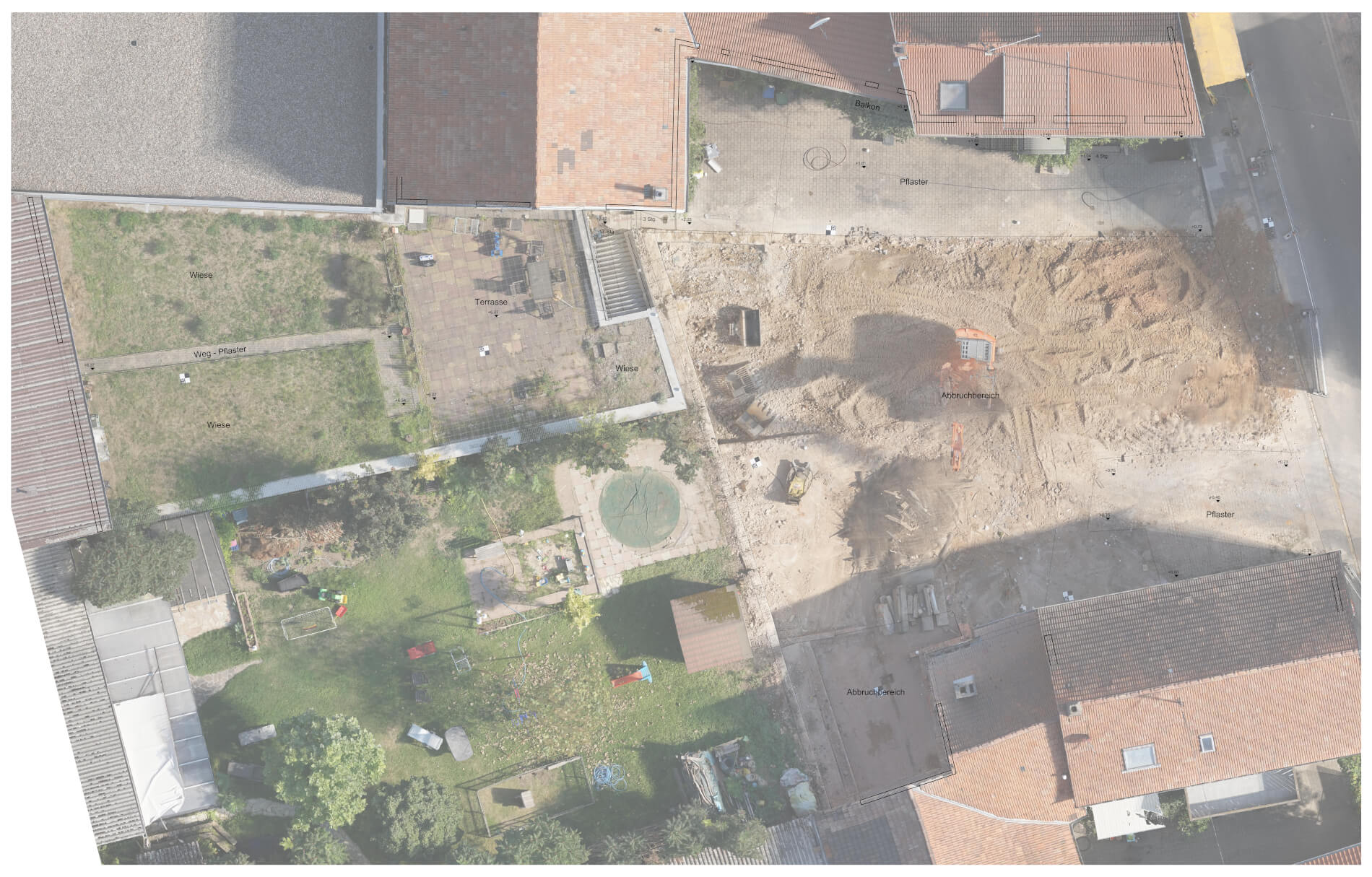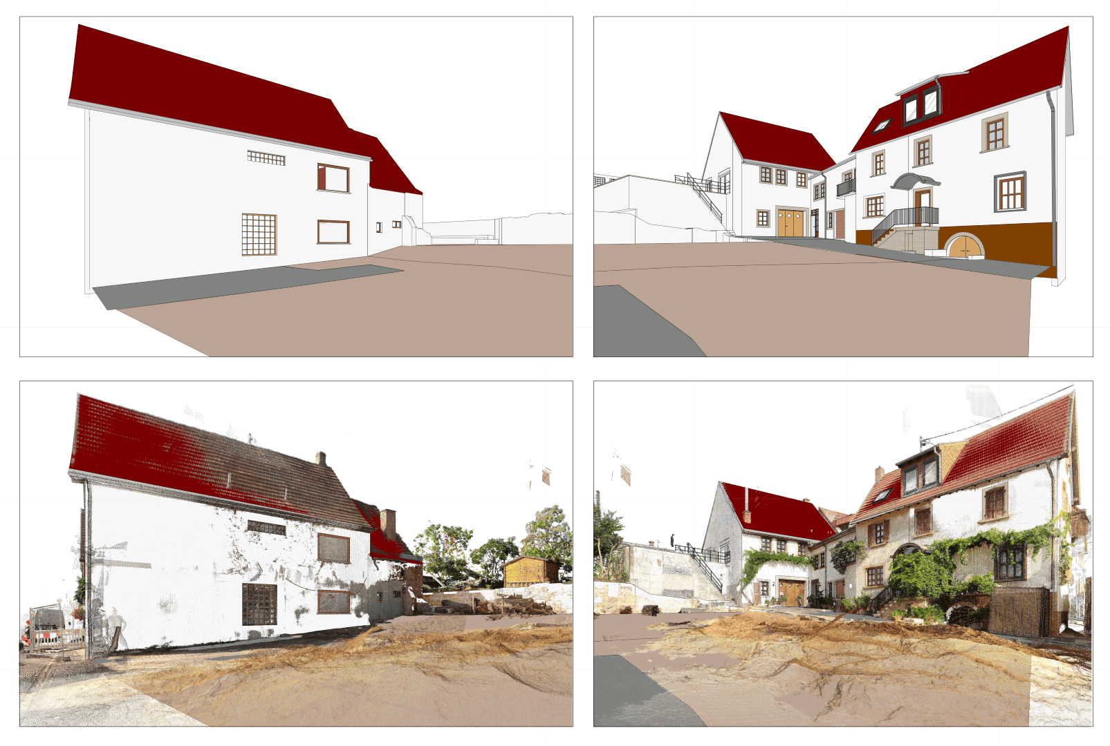 - Übergebene Ergebnisse: Texturierte Punktwolke, georeferenziertes Orthofoto, einfach texturiertes 3D-Modell der Bestandsgebäude, 2D-Bestandspläne und -Grundriss, Renderings aus Drohnenaufnahmen