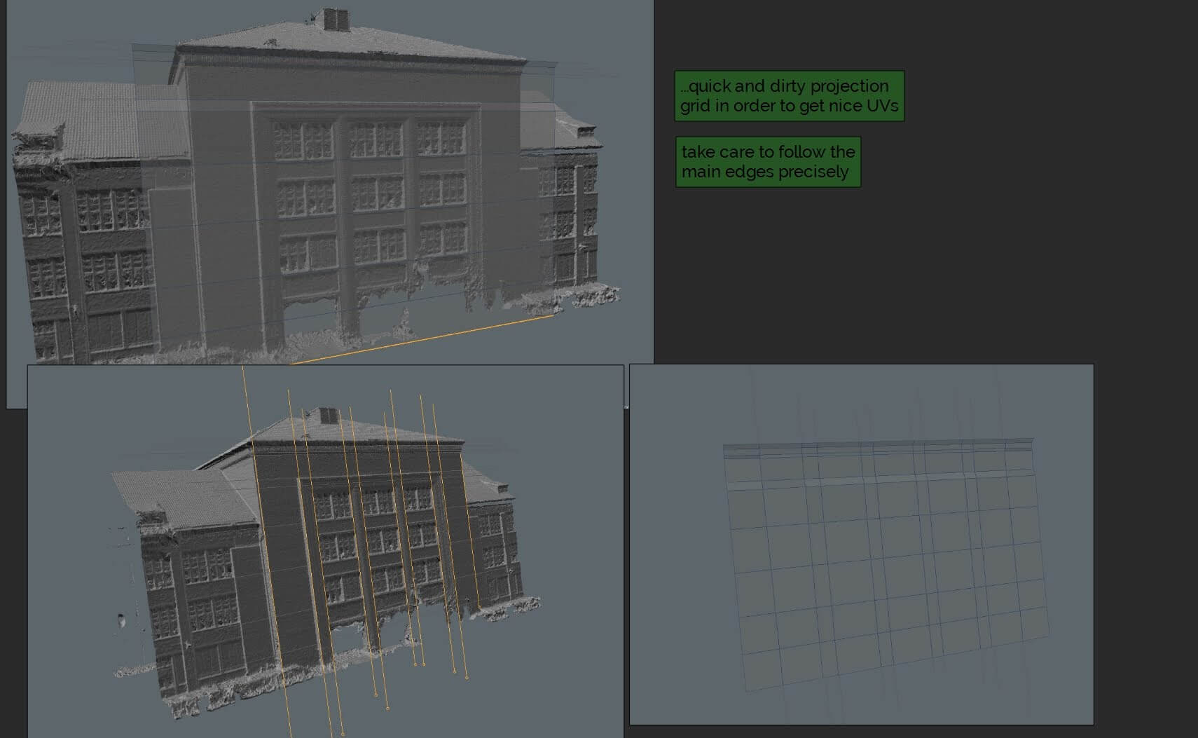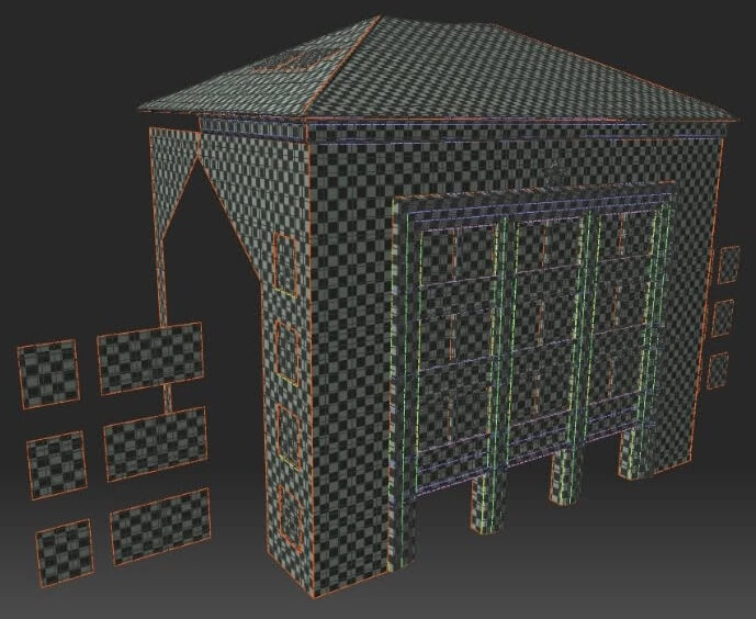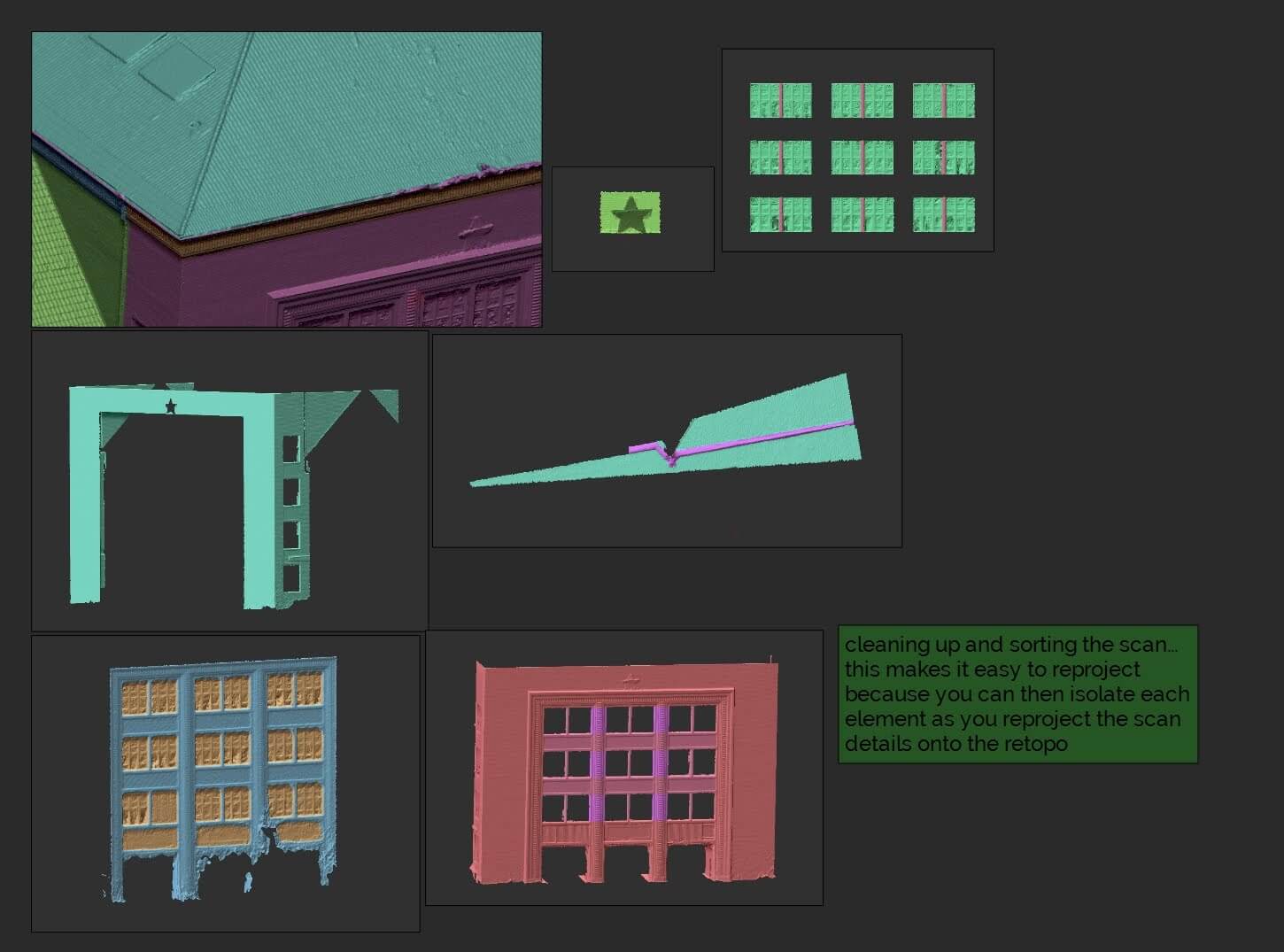 Zusammengefasst wurde das VR Modell der Fassade Vorder- und Rückseite geteilt und dann in einzelne Teile zerlegt und separat bearbeitet.