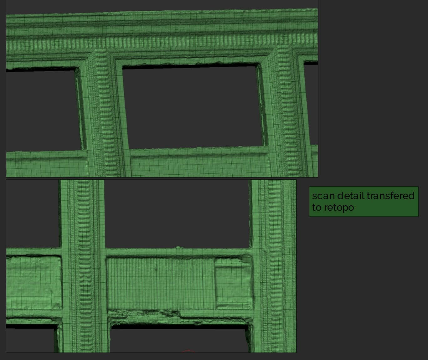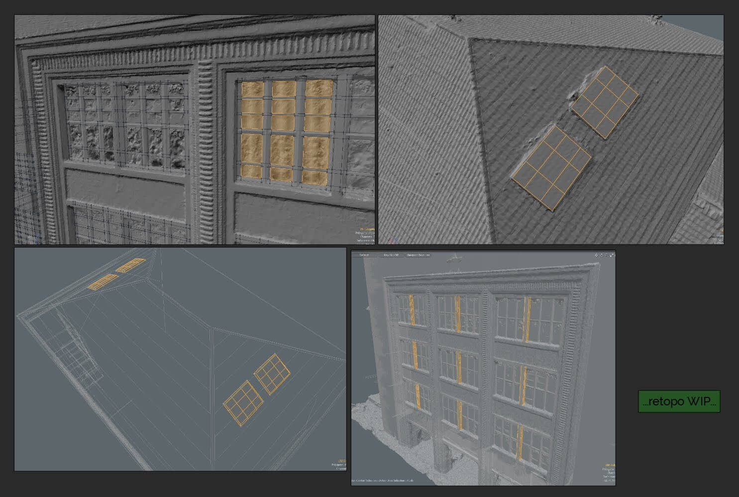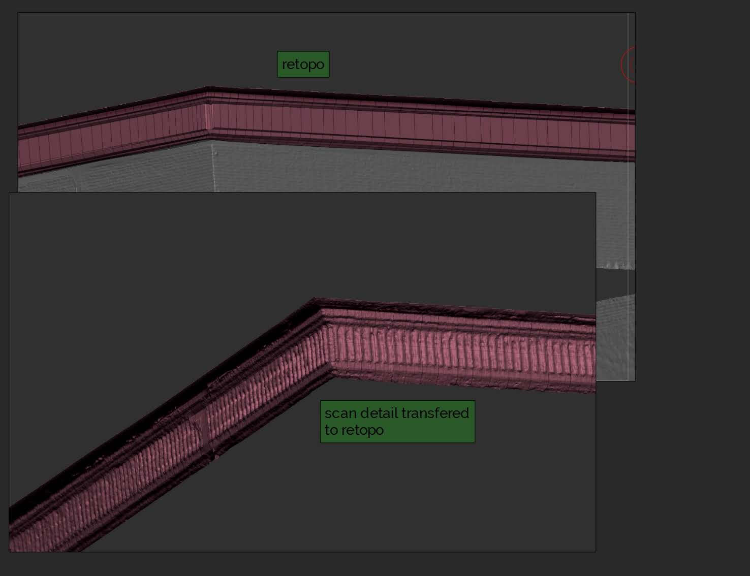 Der Retopology ist ein wichtiger und gleichzeitig sehr aufwendiger Schritt im Prozess, um ein 3D Modell VR ready zu machen. Bei diesem Schritt wird das dezimierte und bis dahin ungeordnete Mesh, bestehend aus Dreiecken, in Vierecke (Quads) umgewandelt. Die einzelnen Polygone aus dem Quad-Mesh werden anschließend manuell sortiert, indem sie an vorhandene Krümmungen, Formen und Kanten des Objekts ausgerichtet werden einen sauberen Mesh Fluss (Edge Flow) zu erhalten. Das Mesh wirkt und verhält sich nach der Anpassung natürlicher und vor allem dynamischer und ist perfekt auf den nächsten Schritt vorbereitet. Im Anschluss werden die Details der ursprünglichen Scan Geometrie auf die Retopo Geometrie reprojiziert um ein hochauflösendes low Poly Mesh und ein sauberes UV Layout zu erhalten.